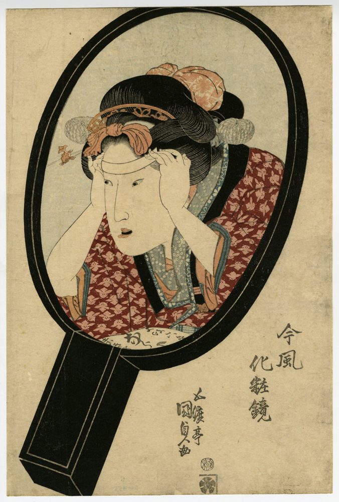 国貞(豊国三代)は時代の好みを反映した粋で艶な猫背猪首型の美人を描いた。国貞の作品は着物の柄に凝ったり、背景がデザイン性の高いものも多い。大首の作品ではまつ毛を細かく毛彫りした表現のものもある。「今風化粧鏡」シリーズでは構図や配色、女性の仕草など国貞独自の工夫が見られる。市井の女性のごく普通の生活から爪を切ったり、歯磨きをしたり、化粧する姿も好んで描いている。(化粧については広告的な意味合いのもの含まれる)