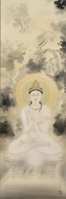 明治11(1878)栃木~昭和20(1945)福島 日本画家。荒井素雲の長男。本名寛十郎。水野年方に歴史画を学ぶ。明治35年國華社に入社し仏画模写の仕事に従事。その後インドに渡り、アジャンターの壁画などを模写。帰国後は仏教に画題を得た作品を中心に院展に出品。法隆寺金堂の壁画模写が未完のまま没した。