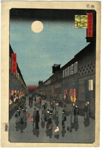 天保の改革を機に水野忠邦によって取り潰されそうになった中村座(一番奥)、森田座(手前)、市村座(真ん中)の江戸三座は、名奉行、遠山金四郎の助言により浅草に集中移転された。これが猿若町。芝居小屋が一箇所に集まったことで、交流も競い合いも盛んになり、町も一大歓楽街として栄えた。画は芝居がはねた後の様子。