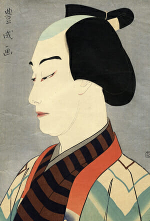 『艶容女舞衣(はですがたおんなまいぎぬ)』の茜屋半七、演じるのは明治・大正期の上方歌舞伎を代表する歌舞伎役者、初代中村鴈治郎(1861-1935)。芸を追求する姿勢で知られ、同じ役柄でも日々型を変えて演じたとの逸話が残る名優。切れ長の目、ほのかに染まる耳朶に色気が香り立つ一枚。