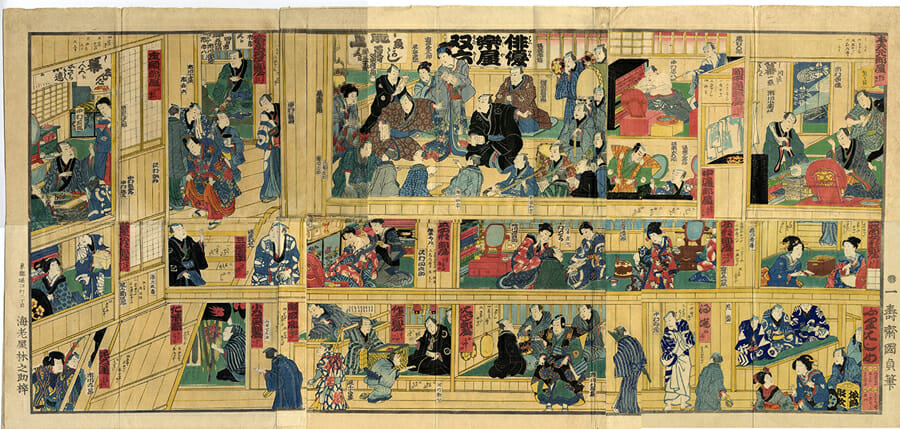 歌舞伎の楽屋を描いた双六。上がりの中央上の部屋には、河原崎権十郎(後の九代市川団十郎)、左の座頭部屋には四代目中村芝翫がいる。下の階には作者や小道具の部屋も見える。