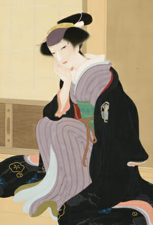 一見、美人画と思いきや、羽織に染め抜かれた「丸に結綿」は濱村屋(屋号)の定紋であること、女形の紫帽子から歌舞伎役者の瀬川菊之丞とわかる。