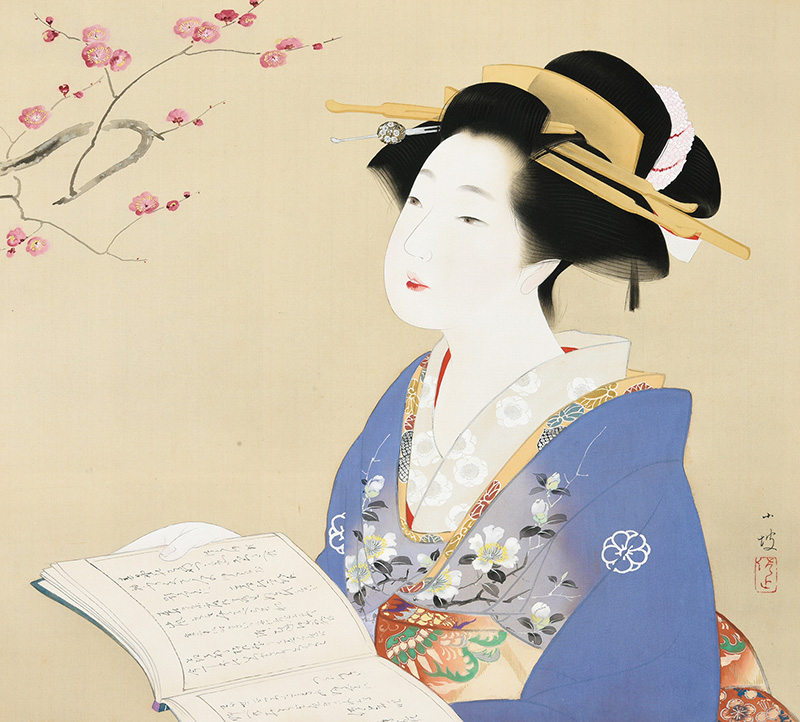 手を休め、ふと見上げた先には梅の枝。唇にさした紅は花よりも赤く、彼女の顔をつややかに引き立てる。その手元にある和本を古今和歌集と知れば、こうした歌も想起されよう。