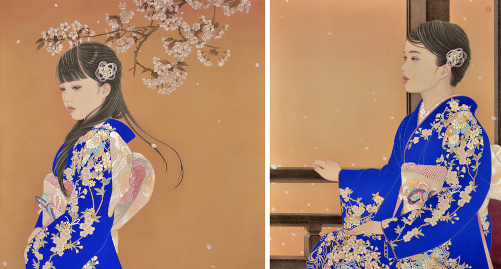 しっとりとした潤いがありつつ軽やかな空気感をまとった女性、咲き誇る花々、時には虎や牛、猫などを日本画の技法で描く。