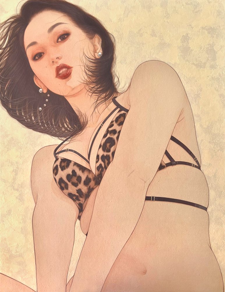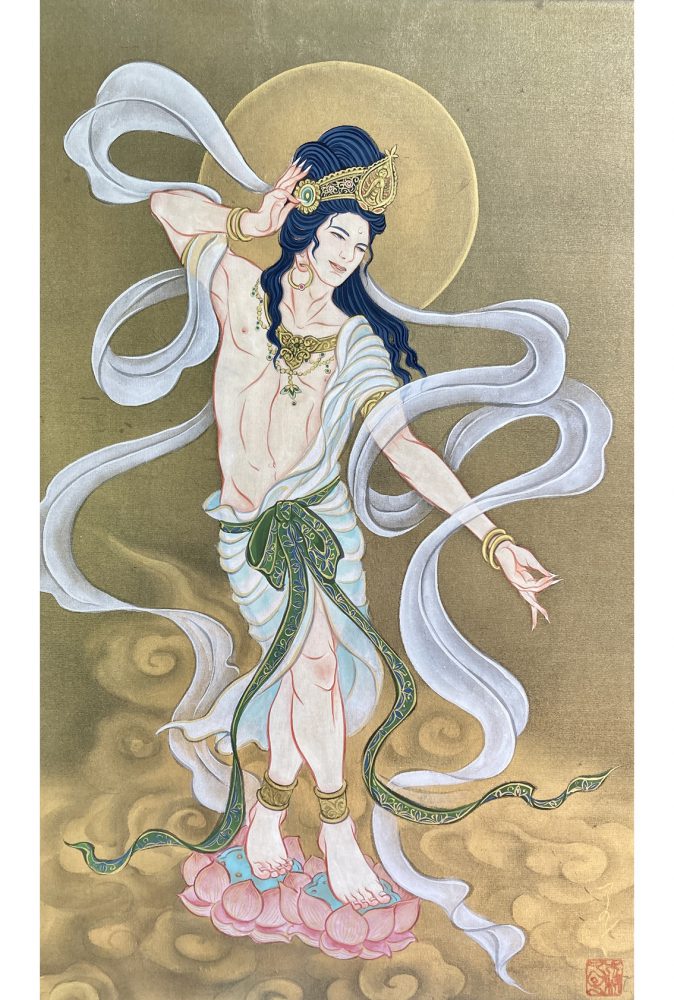 数年前、一連のイケメン仏画制作のために、タイのダンサー、サン・ピッタヤー・ペーファン(Sun Phitthaya Phaefuang)さんに依頼して目の前で踊ってもらった。私の画室で、私のためだけにTバック姿で舞われた彼の静かな舞踊は、ゆっくりとした動作が艶かしくも空気が震える様な緊張感をもって迫り、その美しさに思わず鼻血が出そうになるほど高揚した。ここで舞い出されたとんでもないものを、どう描こうかーーただ見ていただけの私が、その後は崩れ落ちる様に寝込んでしまったのを覚えている。甲斐荘楠音が《舞ふ》を描くために踊り手に舞わせた際は、どんな風に感じたのだろうか?似たポージングを選んだものの、オマージュ作品というよりは舞を見て感じ、描く、というのを共通項としてみた。(木村了子)