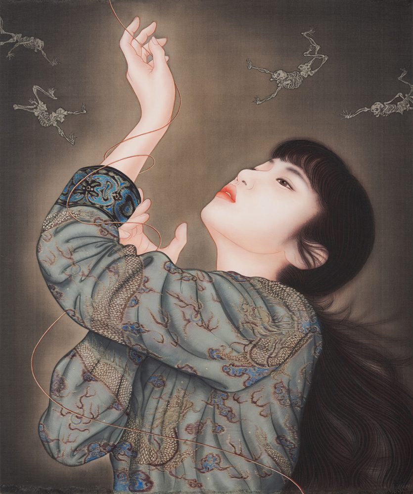 少女は自分の運命の赤い糸に巻き付き、舞いを踊っている。それ(赤い糸)に引きつけられる骸骨が人間のように周りで踊っている。生ある者はいつかは亡くなり、生きている人も骸骨と同じであるという死生観を表したいと考えている。(高資婷)