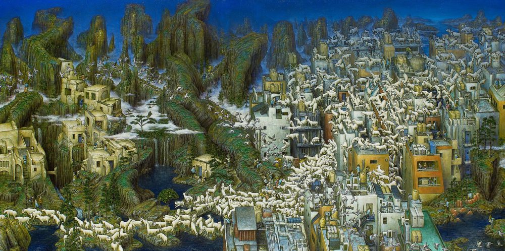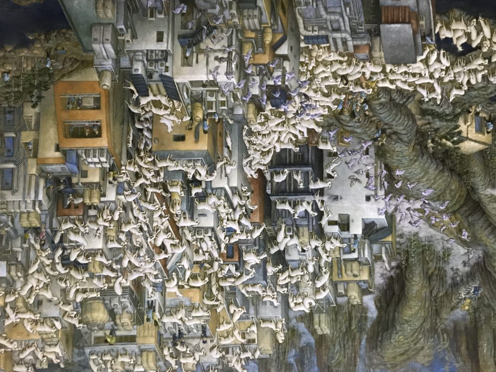 選んだモチーフは大勢の山羊の来迎図。彼らの背負った贖罪、または我々の日常、それらのチューニングを少し変えた先に、遍在するリアルを探った。