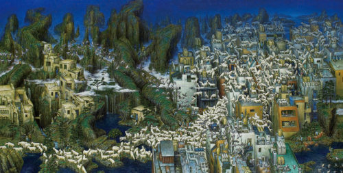 現代の世界全体自体、ありえないほどの異物がぶつかり合い、矛盾しながらも、なんとか調和を保って生きているが、彼の絵はそうした現実を反映したリアルなジオラマと言えるかもしれない。