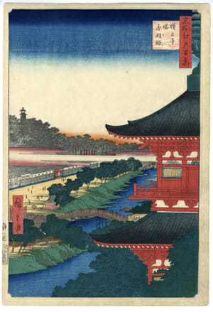 江戸城の鬼門封じとして置かれた上野寛永寺に対し、裏鬼門に配されたのが芝の増上寺。ともに徳川家の菩提寺として幕府の絶大な庇護を受けた寺である。寛永寺の五重塔は現在も上野動物園内で見ることができるが、本図に描かれる増上寺の五重塔は戦災によって焼失してしまった。在りし日の姿を偲ばせる鮮やかな色調が美しい一枚。