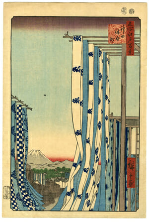 江戸時代、神田には江戸御用達商人の職人が住む職人町が形成されていた。紺屋町は藍染職人が住んでいた町。浴衣地に描かれている「魚」は版元の魚栄からとった文字。もう一つの四角い模様は広重のヒロを図案化したもの。 櫓のように組んだ干場で風にそよぐ染め上げた生地。その合間からのぞく富士山。江戸の風情を感じさせてくれる作品。