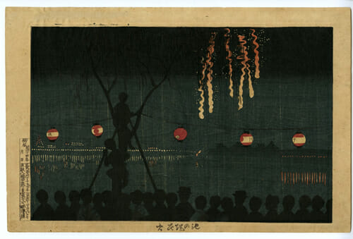 光線画の父として知られる小林清親。本作に描かれるのは、まさに光線の芸術ともいえる花火の景である。本図刊行の一年前には、同じく花火を主題とする《両国花火之図》が発表されたが、これは花火が満天に花開いた瞬間をとらえた作品であった。一方この《池の端花火》は、しゅるしゅると夜空を滑る花火であり、前者とは対照的に暗い風景である。決して華やかな作品ではない。しかしだからこそ、この闇からは夏の夜の匂いや忍び寄る秋の気配までもが感じられる。