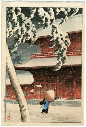 東京二十景の中の一枚。建物の赤と雪の白のコントラストが美しい、関東大震災後の巴水の代表作。震災後は都市の近代化が進んでいくが、この芝増上寺には江戸の情緒が感じられる。実際に客はこうした江戸情緒を巴水の作品に求めていたとも言え、この作品後、同様の画風の作品が多く制作される。