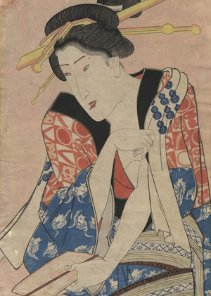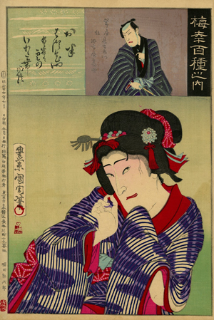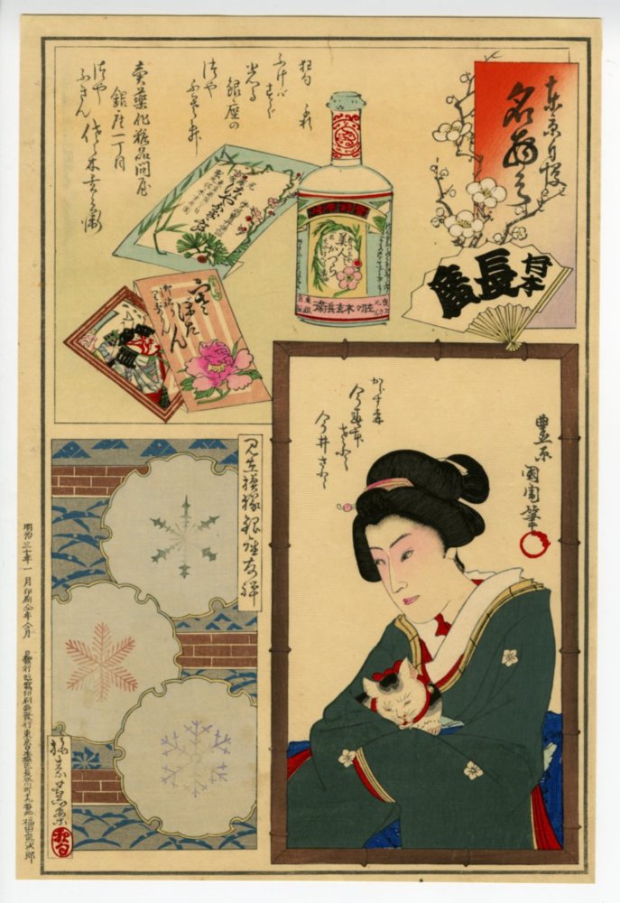 明治29年から30年にかけての作品。100枚以上の揃いで上段に賛を添えた名店の紹介、下段左に名所やその場所の名物からヒントを得た見立て模様、下段右に芸妓や女芸人の半身像が描かれています。