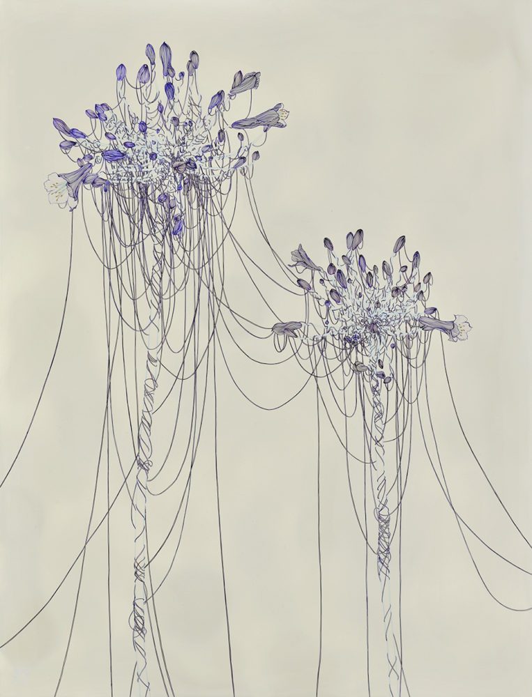 二人目は糸をモチーフにたおやかな世界を表現する里美穂(さとみすい)。描かれる糸はドライフラワーや、手や、足と絡み、さらに糸と糸で絡み合い、垂れ下がる。主として和紙にペンで描かれた糸と重力の織りなす世界はどこまでも繊細で、静謐で、丹念に宇宙の起源をたぐりよせるように見えます。