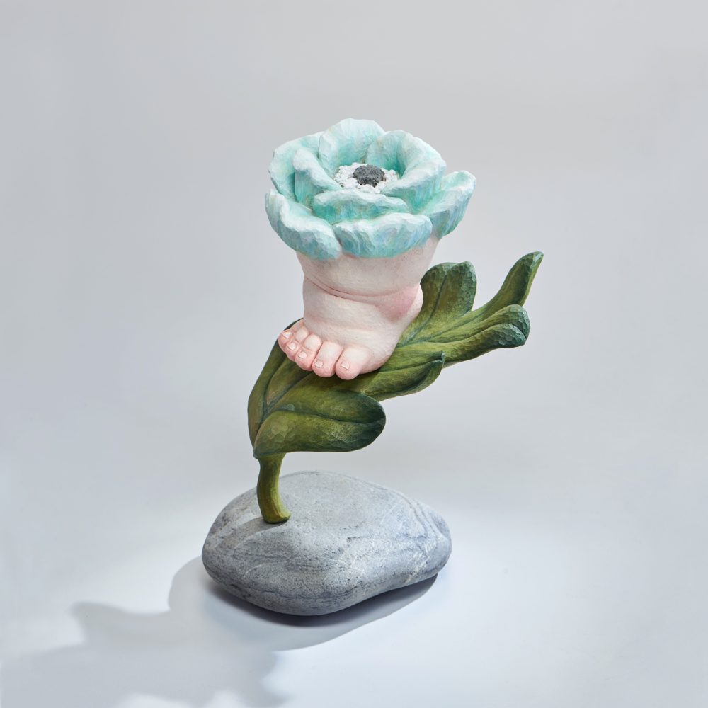 三人目はこどもの足と植物を組み合わせ、不可思議で愛らしいキャラクターをつくるファン・ピントン(黃品彤)。ふくよかな身体は生命の糧のように心に豊かさを感じさせ、木の温もりが作品を引き立てます。
