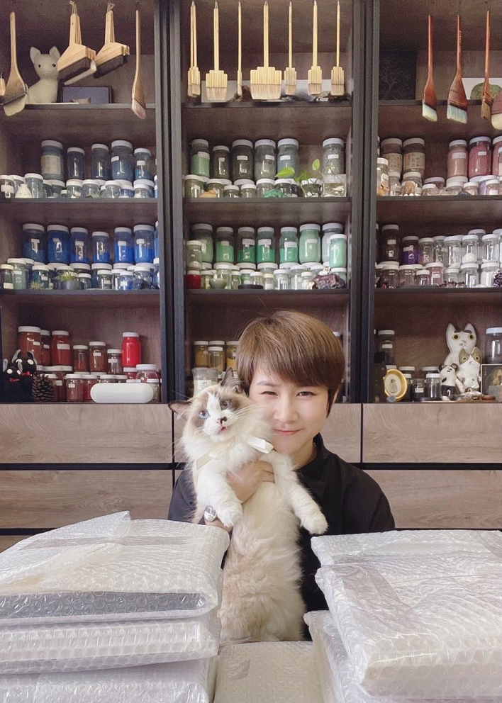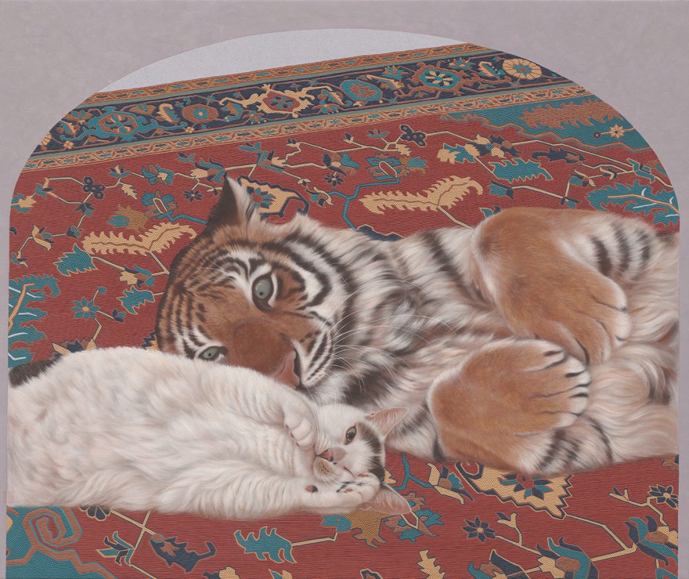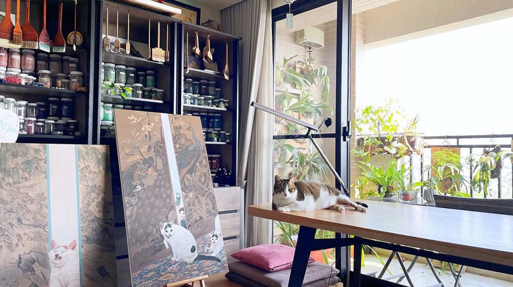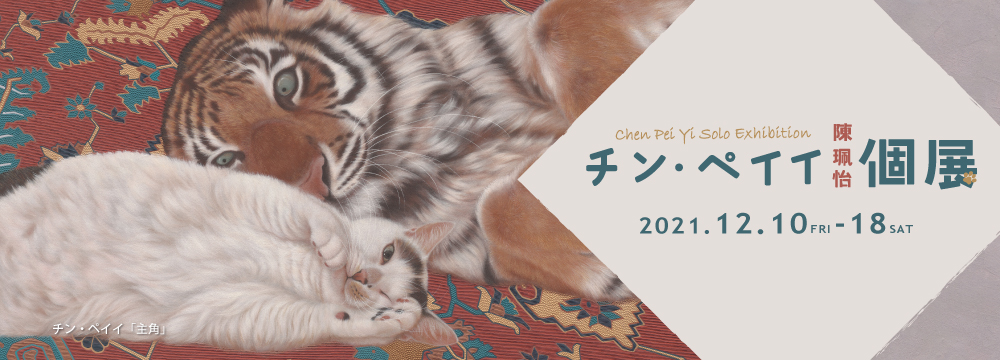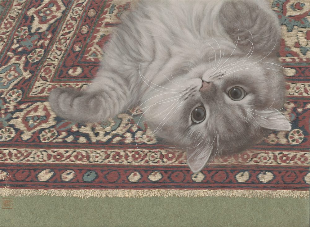 「猫を描く場合、やさしく絵筆を下ろしながら猫の毛の模様とふわふわとする感触を描いていきます。また、織物が好きなので、オリジナルな方法で岩絵具を積み重ねて彫刻のような立体とした表現をしています。ゆっくりと絵具を重ね、ひたすら点と線にすることに専念して描き続け、織物を仕上げています。」(チン・ペイイ)