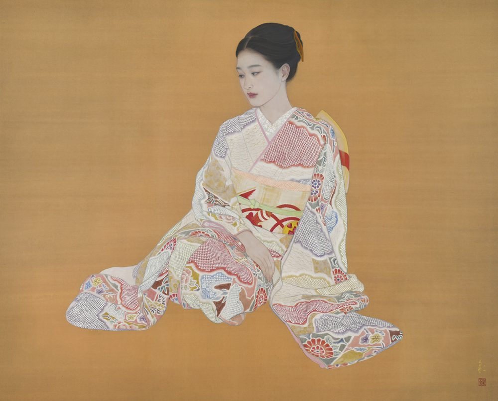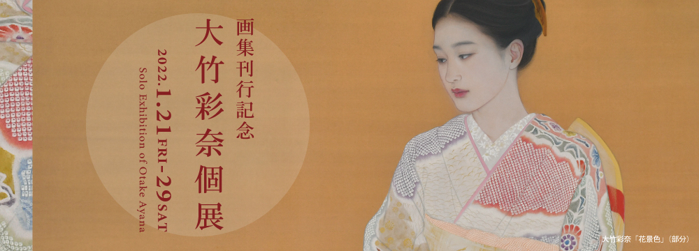 人肌のぬくもりを表現した肌の色、華やかな着物の配色、シンプルだが力強い背景描写で多くの人々を魅了する大竹彩奈の美人画。
