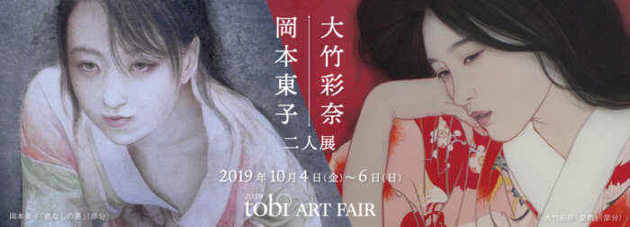人肌のぬくもりを表現した肌の色、華やかな着物の配色、シンプルだが力強い背景描写で多くの人々を魅了する大竹彩奈の美人画。