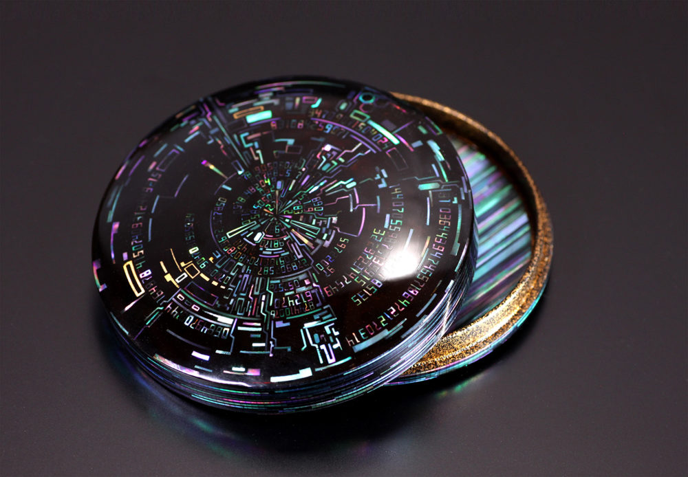 レーザーでカットした数字型の貝殻を漆を塗った木地に貼ることで漆芸という古い手法に宇宙を感じさせるような現代的な美しさを生み出している。