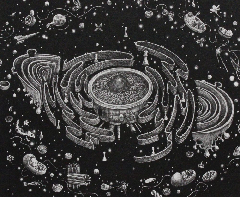 現代の世界全体自体、ありえないほどの異物がぶつかり合い、矛盾しながらも、なんとか調和を保って生きているが、彼の絵はそうした現実を反映したリアルなジオラマと言えるかもしれない。