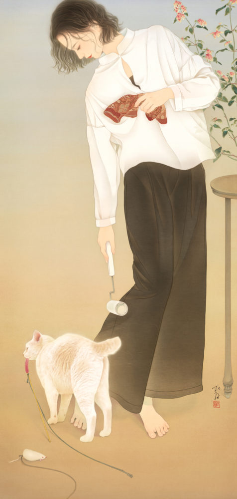 しっとりとした潤いがありつつ軽やかな空気感をまとった女性、咲き誇る花々、時には虎や牛、猫などを日本画の技法で描く。