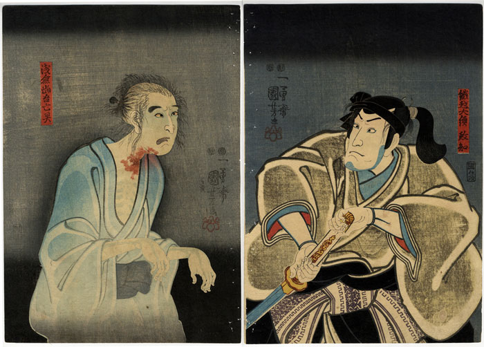 4代目鶴屋南北(つるやなんぼく)の代表作、東海道四谷怪談でおなじみ。 塩冶家の浪人四谷左門(よつやさもん)の娘お岩とお岩の夫、極悪非道な民谷伊右衛門(たみやいえもん)の物語。
