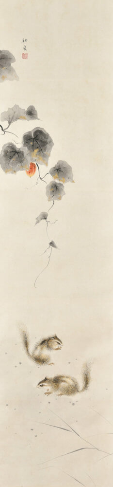 墨と絵具の滲みや掠れの応用によって、朽葉や栗鼠の毛並みの質感が見事に捉えられ、伝統的な画題としてではなく目の前にある詩情を湛えています。