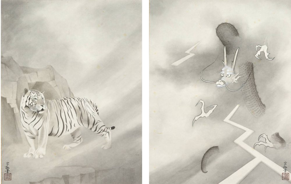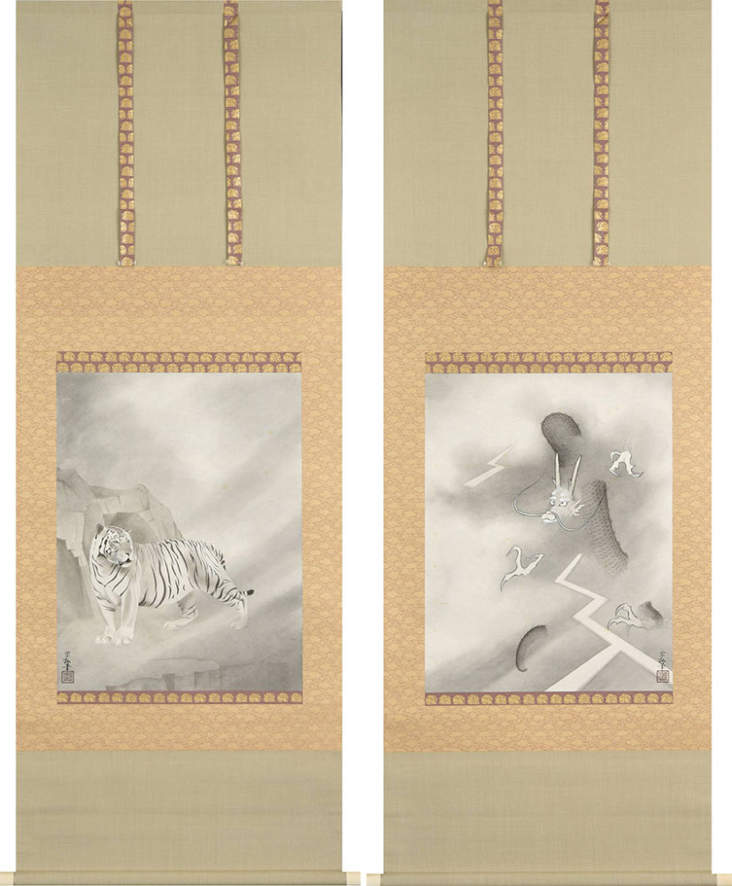 龍と虎の組み合わせは、それぞれ水を司るものと風を司るものとして、また力の拮抗した好敵手の象徴としてよく知られた画題です。