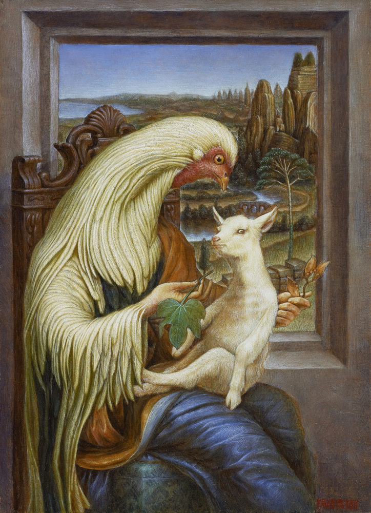 最近一貫して絵に登場する人型の鶏は、謎多き民族として名高い古代メソポタミア、ウル王朝の調度品「ウルの牡山羊」をモチーフにしている。