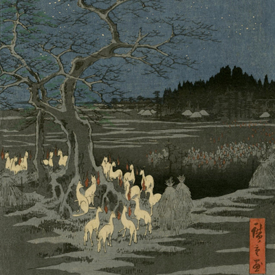 大晦日の夜半、王子稲荷神社近くの大榎(装束榎木)の下に狐火をともした狐たちが集まっています。