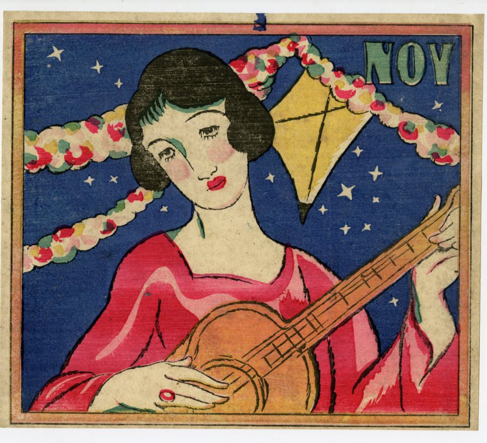 版画ならではの洗練された色数の中で、夢二らしい流麗な線で描かれた美人の横顔が映えています。