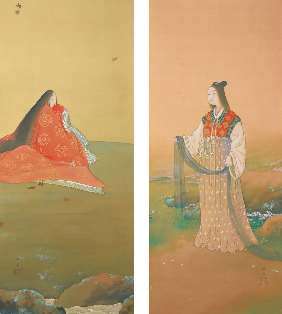 林響は画中においても、花の咲く春の野の前に立つ佐保姫は天平の衣裳、名所竜田川の背後で散る紅葉の中に座す立田姫は平安の女房装束と、それぞれの女神の対比が意識され、芽吹きの春の力強さと、しっとりとした秋の優美さを表現することに成功しています。