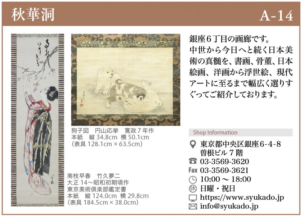 秋華洞では円山応挙や琳派など厳選した古美術の他、浮世絵や近代の作品の展示する予定でおります。