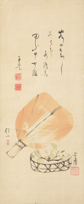 団扇、青梅、水鶏(くいな)はいずれも夏の季語。水鶏ことヒクイナは、その鳴き声が戸を叩くような音であることから、「水鶏叩く」の語で多くの歌に詠まれてきました。それならば本作の賛は、客人が帰った夏の夕方に、水鶏の声だけが響く静かな時間を詠ったものでしょうか。抱一父子と五竹庵との接点は明らかではありませんが、抱一は宝井其角にも私淑していたため、俳諧からのつながり、特に蕉門の俳人たちとの交流が考えられます。水を存分に含んだ流麗な筆致が目に涼しい一幅です。