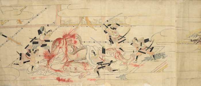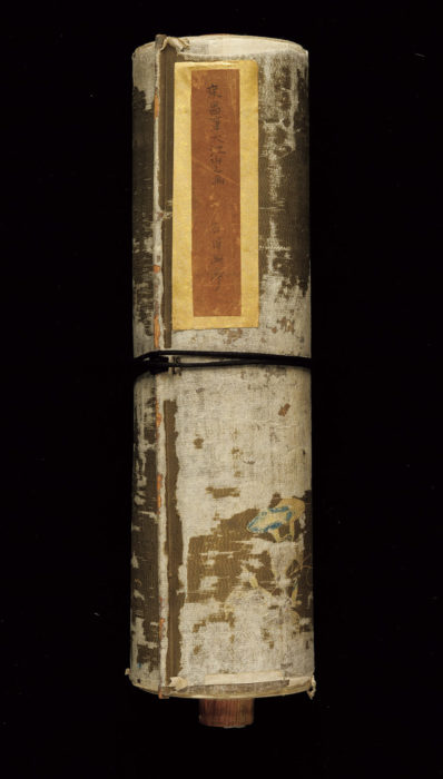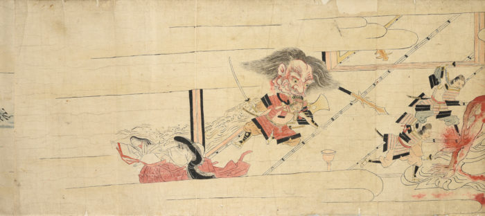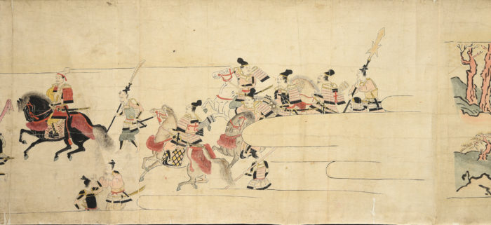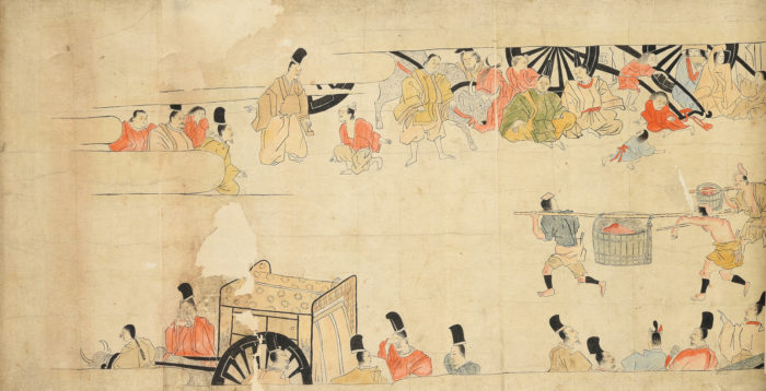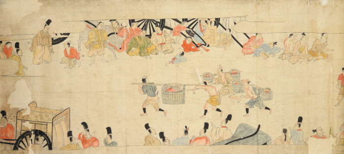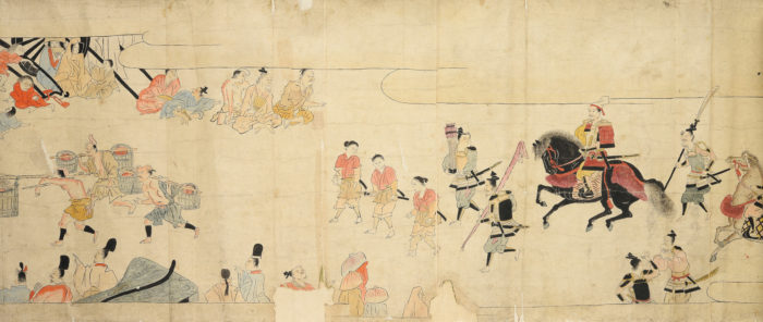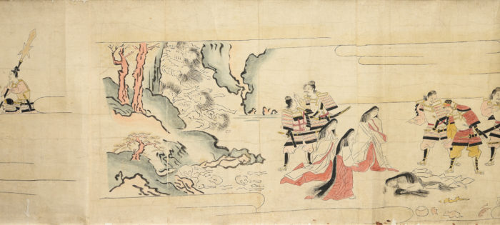 題箋に記された乗昌とは、江戸前期の絵師沼津乗昌のことでしょうか。本作は部分部分で描き振りが異なり、少なくとも二人の絵師の手によるものと思われます。おそらく、経年による破損部分を後年描き足して繋げたのでしょう。都度手にとっては大衆を楽しませたであろう、身近な娯楽品としての伝来が推察されます。