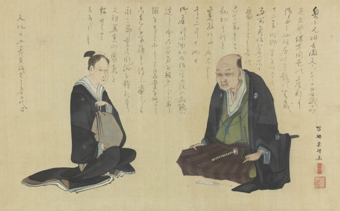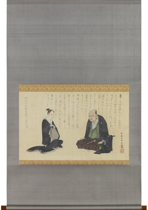 90歳で没するまで生涯に渡って頻繁に画号とその画風を大胆に変え続けた北斎。本作は「百琳宗理」の号から、北斎が勝川派の門下を離れた30代半ばの寛政7年(1795)~寛政9年(1797)、豪奢な摺物や肉筆浮世絵を精力的に手がけ始めた頃の注文画であると考えられる。画中の吉岡文六なる人物の詳細は今に伝わってはいないが、文中から寛政8年に御奉行小田切土佐守侯の高聴に達し、今の家名をついだという、その記念に描かせたものか。未だ研究途上の宗理時代を知る上でも貴重な一作である。