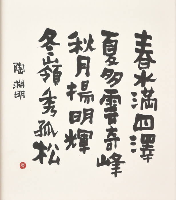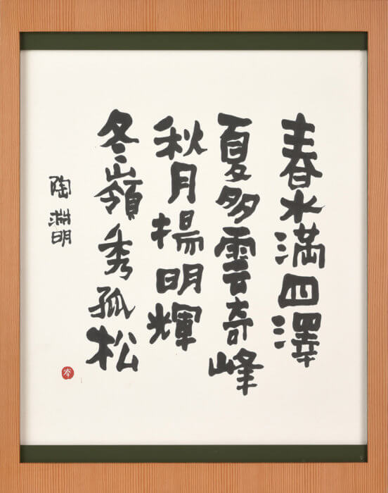 四季それぞれの特色を鮮やかに、そして端的にうたうこの陶淵明の詩を、力強くぬくもりのある筆致で書き表しています。緒形拳は俳優業の傍ら、絵画、陶芸、篆刻、そして書など、様々な創作活動に勤しんでいました。役を演じることにとどまらず、その感性を様々な芸術表現に発揮した緒方の、英気と才能が光る作品です。