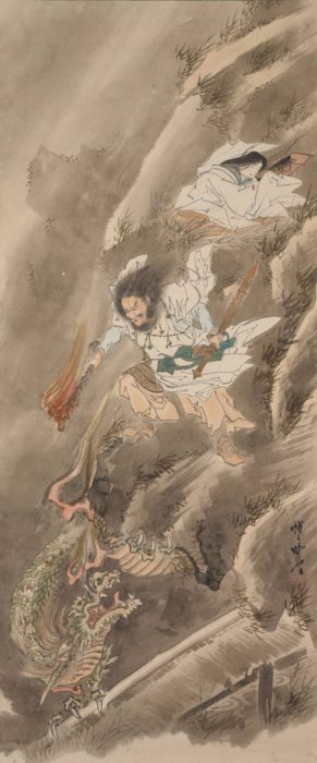 ジョサイア・コンドル手記によれば、1865年、30代半ばの暁斎は信州を遊歴し、九頭竜伝承の源たる戸隠山に登り、神々の住まう峰ごとの社を一日中参拝したという。嵐吹きすさぶ山岳で、堂々たる素戔嗚尊(ルビ:スサノオノミコト)と九頭龍が対峙する劇的な本作。大胆かつ繊細な筆勢は息を飲むほどに見事であり、圧倒的な画力のみならず、絵師の超自然的な存在に対する崇敬の念さえ読み取れる。神話世界は鬼才暁斎の手によって画面に新たな魂を得て、今なお躍動し勇猛な英雄譚を紡いでいる。