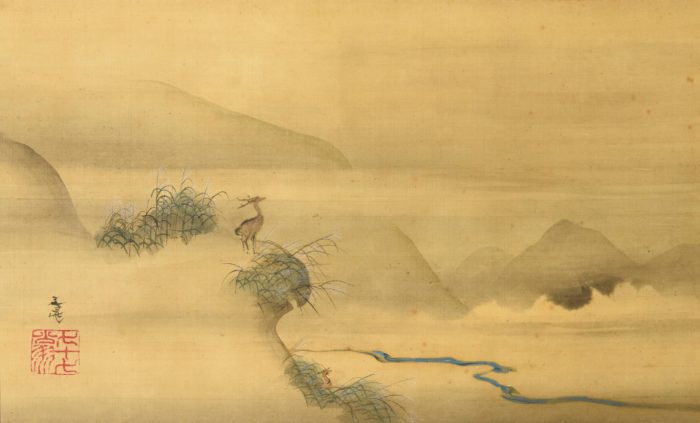 鹿は「禄」の字と中国語で音通することから、古くより吉祥画題として描かれてきました。また、淡彩ではありますが青や緑を施した青緑山水も、時に福徳的な意味を持ちます。一方本作の魅力は鹿の鳴く声が聞こえてくるような叙情性でしょう。 八宗兼学と評された文晁によって、中国的な祥瑞モチーフが和歌の世界に融合した一幅です。