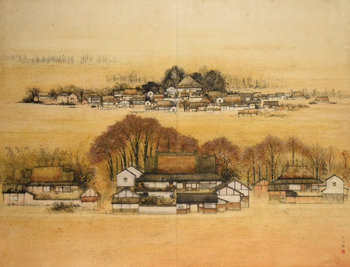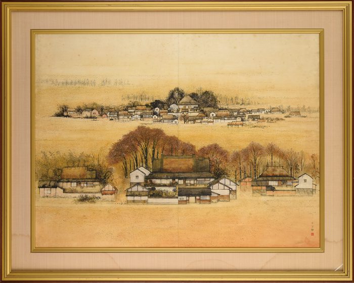 本作品は、戦時に不染鉄が疎開させる品々などを描き留めた手控帖に記録される、昭和16年大東南宗院の創立にあたっての招待出品作と目されており、非常に貴重な一品である。手控帖によれば西ノ京にある「山の小屋」にて八割方描き、東京にて仕上げたものであるという。画業の前半期から繰り返し描かれた、田園地帯に民家が並ぶ「奈良の稲の稔る秋」の景色には、全体に様々な濃淡でこがね色が付され、眩しくも優しい郷愁が漂う。