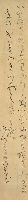 越後帰住後、十数年間過ごした国上寺の五合庵に別れを告げた50代以降に詠まれた歌であろう。この五合庵時代、書の古法帖を学び、独自の風雅な草仮名の書風を体得した良寛。以降、和歌の表現に漢字の持つ造形美が加わり、筆さばきには素直な心情が反映され、書作の円熟期を迎える。愛惜の情を抑え軽やかに記された本書にも、良寛の清廉な生き様と虚静恬淡とした性格が表れているようだ。