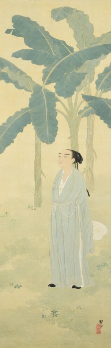 蹈青(踏青)とは、中国唐時代盛んであったという仲春から晩春にかけて行われたとされる古い行事で、男女が郊外の野山で春の青草を踏んで遊ぶこと。ついで桃や李の樹の下で酒宴を開いたといいます。青々とした葉を広げた芭蕉の傍らに佇む青年は、穏やかな微笑みを湛え、麗らかな春の陽を楽しんでいるようです。