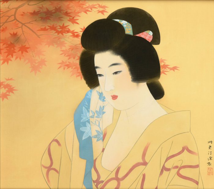 「此君亭」から「此君汀」へと落款を変えた一時期、昭和20年代頃の作品であろう。和髪の佳人が首筋を拭う仕草は、《出湯》の題とともにこの頃の深水が好んだモチーフである。一般に丸髷は既婚者の髪型とされるが、若いほど髷が大きく、髷を飾る手絡の布は鮮やかになる。秋の気配色濃い湯場を背に、み空色の手ぬぐいが爽やかに映える本作。頬をわずかに上気させた新妻の色気を深水は瑞々しく描き出している。