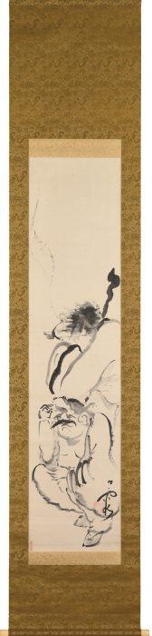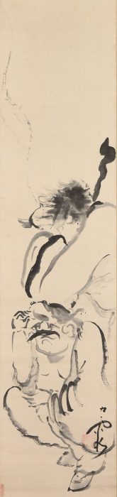うっすらと笑みを浮かべ、頭上のヒキガエルと戯れる蝦蟇仙人こと劉海蟾。その後方で鉄杖を持ち、煙草をふかすように魂を遊離させているのは中国八仙の一人である李鉄拐です。「蝦蟇鉄拐」は顔輝や雪村の作をはじめ妖異で奇怪な主題として知られますが、本作では一風変わったほほえましい情景が浮かんでいます。戯画的作品を多く残し、時には厳粛な高士の威風すらも和ませた大雅のユーモアが感じられる一作です。