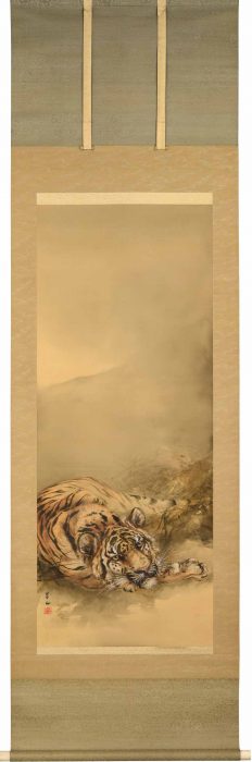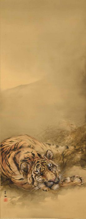 霧に揺らぐ奥深い山を背に、丹念に毛描きされた虎はゆったりと体を横たえ、ここに「敵なし」といったところでしょうか。描かれた大正2年の前年から須磨に移住した翠石。この後、濃密な背景描写が特徴的な「須磨様式」を確立してゆきますが、結核療養中でもあったこの時期には、生死を意識させる作品も見受けられ、こうした翠石の心境が雄々しいのみではない虎の姿や余情溢れる画面を生み出したのでしょう。