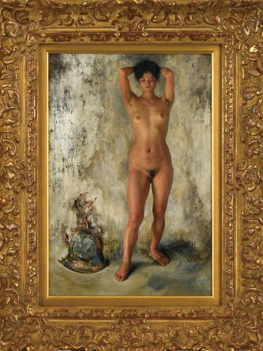 1966年に渡欧し、牧野は私淑するレンブラントにじかに触れる。本作はその直前、64年の作だ。当時牧野は、前衛の潮流の中で、古典絵画を志向する自らの在り方に苦悩する書簡を残している。本作の珍しく明るい背景、大きく残された刷毛目は質感・空間の両立をなそうとした試行錯誤の結果だろう。裸婦というシンプルな主題と隅々まで刻銘な描写は迷いの中で前衛・古典両者を相手取ろうとする牧野の覚悟の証だ。