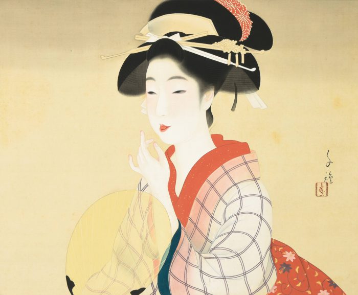 ホオヅキの実を口に含み笛を吹く若い女。唇が舌を挟んだように見える官能的な描写にドキリとさせられる。襟元から帯に続く赤の濃淡の連続が少女らしさとともにどこか性的な挑発も示唆しているようだ。水うちわや簪の半透明の表現は難易度が高く画家の挑戦心がうかがえる。木谷千種は島成園らと並ぶ大阪閨秀画家。本作は大正期のものであろう。一種のデカダンな雰囲気が時代の緊張感と成熟を象徴しており興味深い。