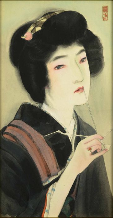 細くよった紐を咥える女性の視線が物思わしげに彷徨う。乱れた髪の墨のぼかしは影との境を曖昧にし、淡い輪郭線と相まって彼女の存在感を危うくする。黒い髪と着衣で際立った白肌は鮮やかな紅に染まり、泣きはらしたかのような目元の朱と鮮やかな唇が一際艶めかしい魅力を演出している。右手薬指に光る指輪さえ彼女が抱える状況を暗示するようだ。深水の巧みな色彩感覚と確かな筆さばきが女の強い情念を描き出している。