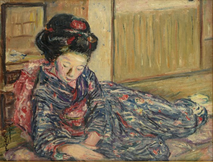 中沢は1903年ごろから度々京都に赴いて舞妓や芸妓を描き、後に土田麦僊と並んで舞妓の画家とも称されるほど多くの作品を残しました。黒田清輝に学び外光派の表現を継承した彼は幻想的な作風を得意としましたが、本作で見られる勢いのある筆使いにはゴッホなどの影響も感じさせ、前年の渡欧の成果が得意とした題材に表れているようです。