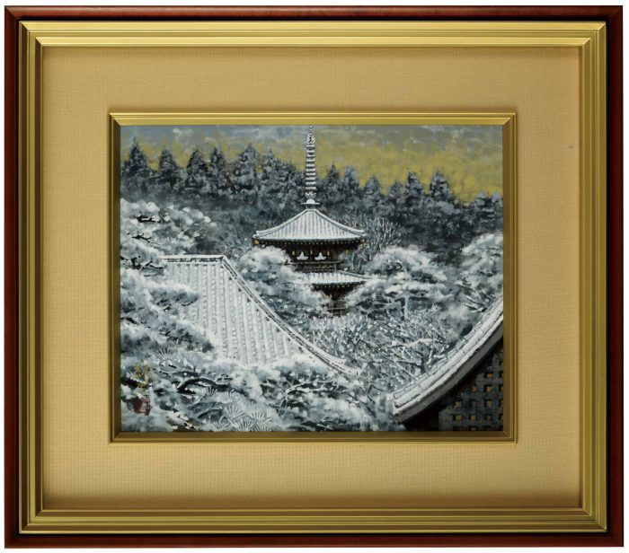 寺院に生まれ 、若年期には高野山をはじめとした50か所以上の大和の古刹を写生し渡り歩いたという後藤純男。寺を描くときは常に歴史への憧憬をもってし、四季の自然それぞれが古き時代を鮮やかに呼び起こすのだと語る後藤は、なかでも普段は彩にみちた風景が白一色に包まれ、建物が自然へと溶け込む雪景を好みました。綿密な雪の描写は、しんと静まり返ったある一時をも映し出すかのようです。